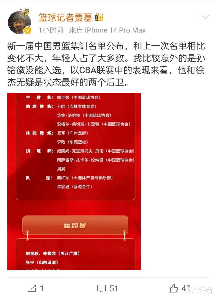 对于上述二人的落选,不少媒体人也纷纷通过社媒阐述个人观点,其中,篮球记者贾磊表示:新一届中国男篮集训名单和上一次相比变化不大,年轻人占了大多数。我比较意外的是孙铭徽没能入选,以CBA联赛中的表现来看,他和徐杰无疑是状态最好的两个后卫。